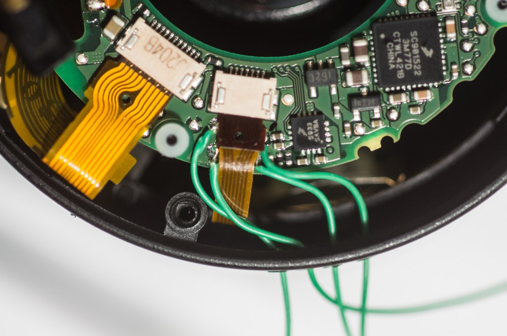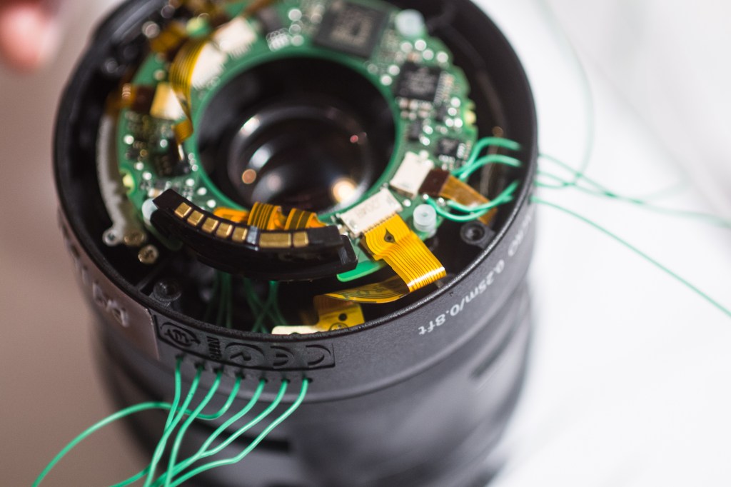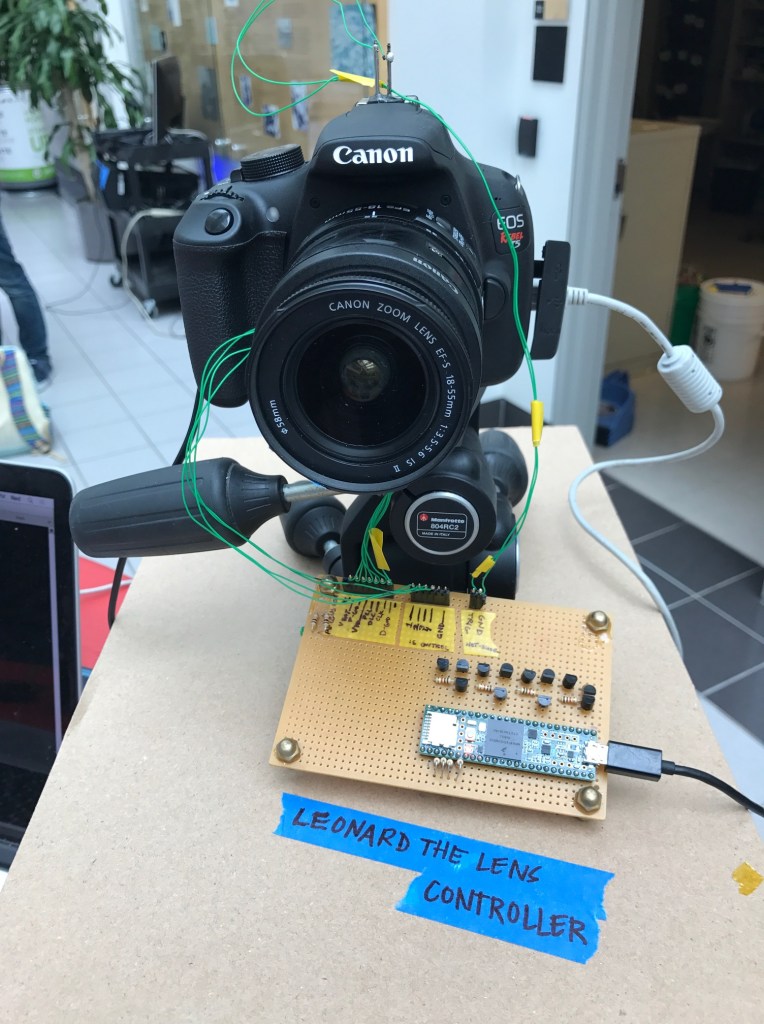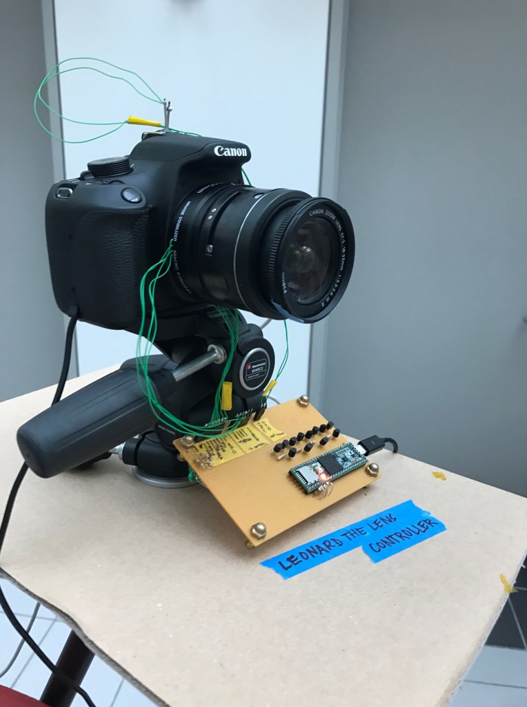 Leonard the lens controller runs on an ATTiny microcontroller. When the camera takes a picture, a signal is relayed from the hotshoe to the microcontroller, which then uses a series of discrete H-bridges to control the lens coils as desired.